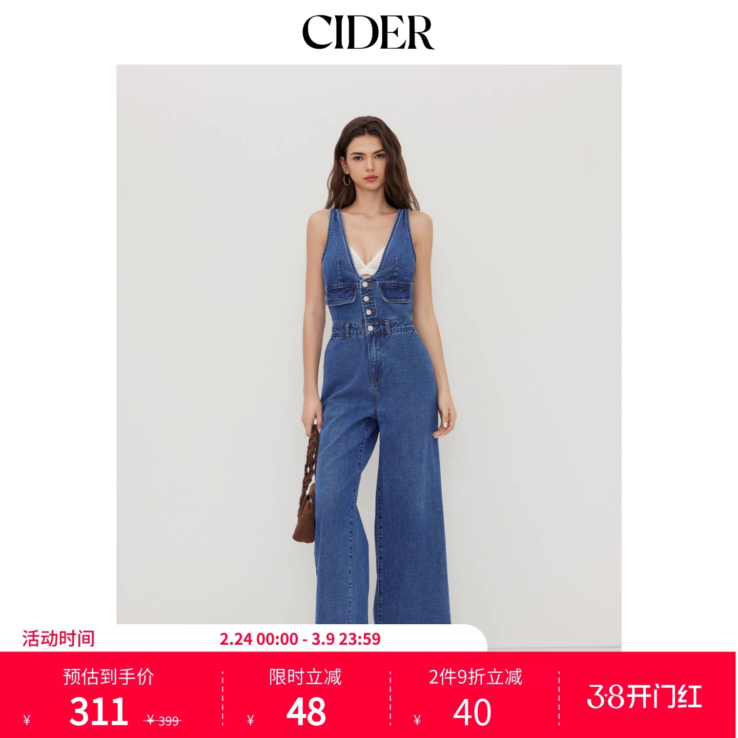 CIDER春秋女装牛仔V领纽扣口袋阔腿连体裤114498326