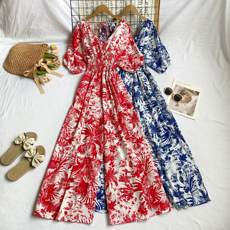 2023夏季新款复古法式V领印花泡泡袖露背系带高腰阔腿连体裤长裤