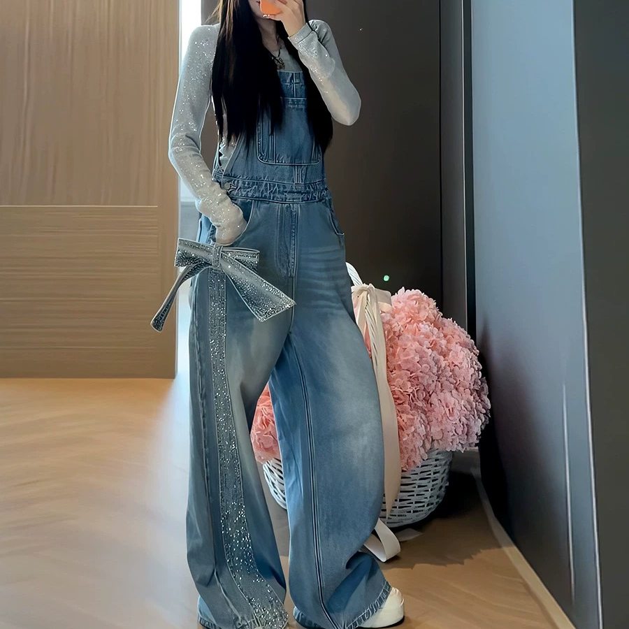 港风复古烫钻蝴蝶结牛仔背带裤女2026春夏新款宽松显瘦阔腿连体裤