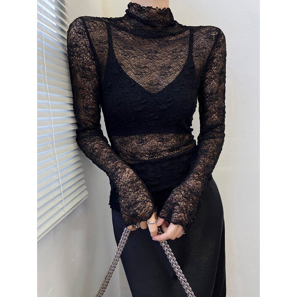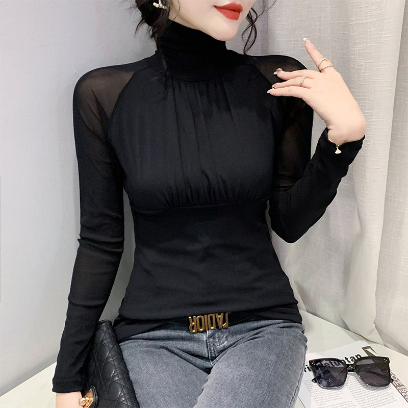 黑色高领打底衫女秋冬欧货性感网纱长袖T恤紧身内搭上衣洋气小衫