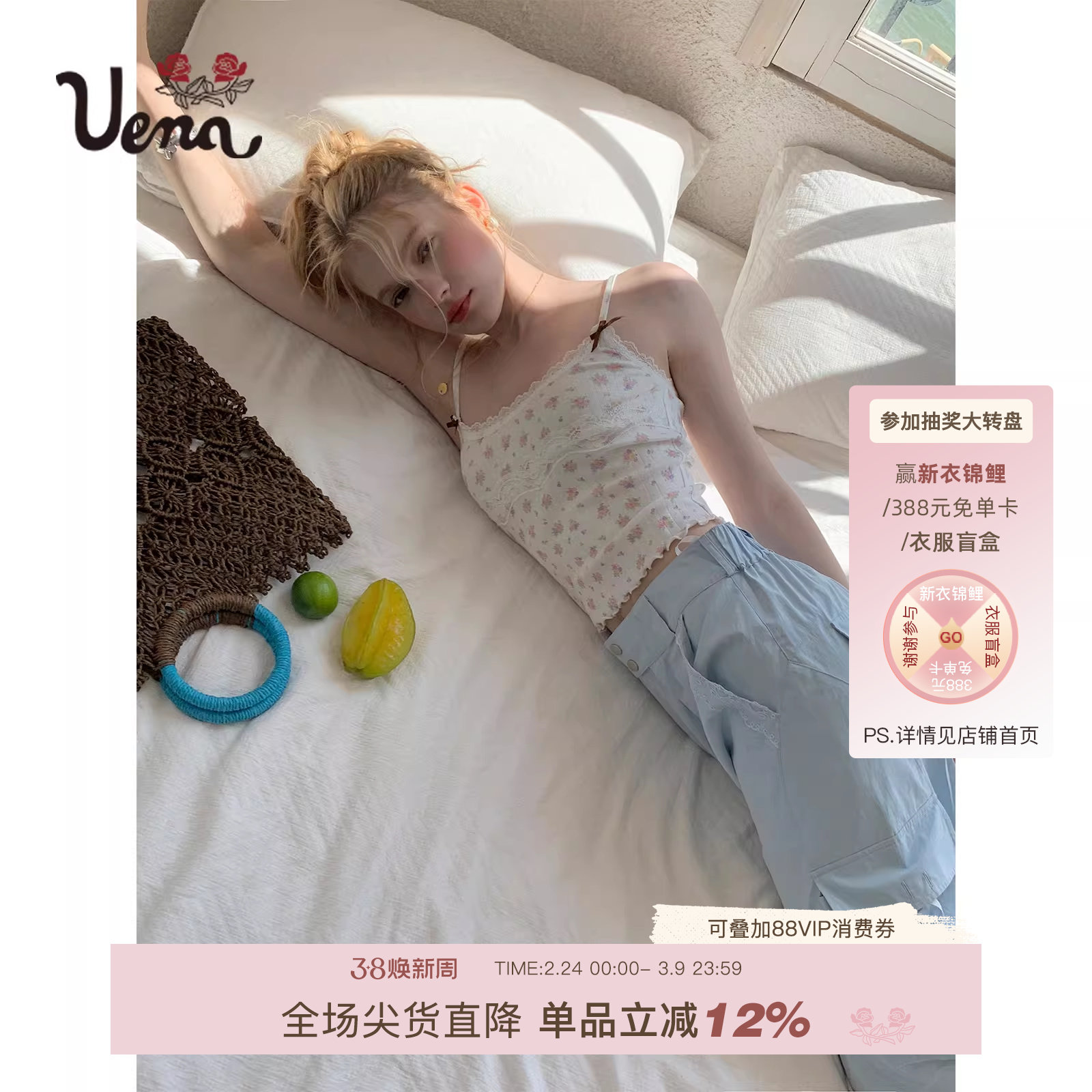 【薄雾花诏】Uena明星同款碎花蕾丝边吊带背心针织开衫短裤套装女