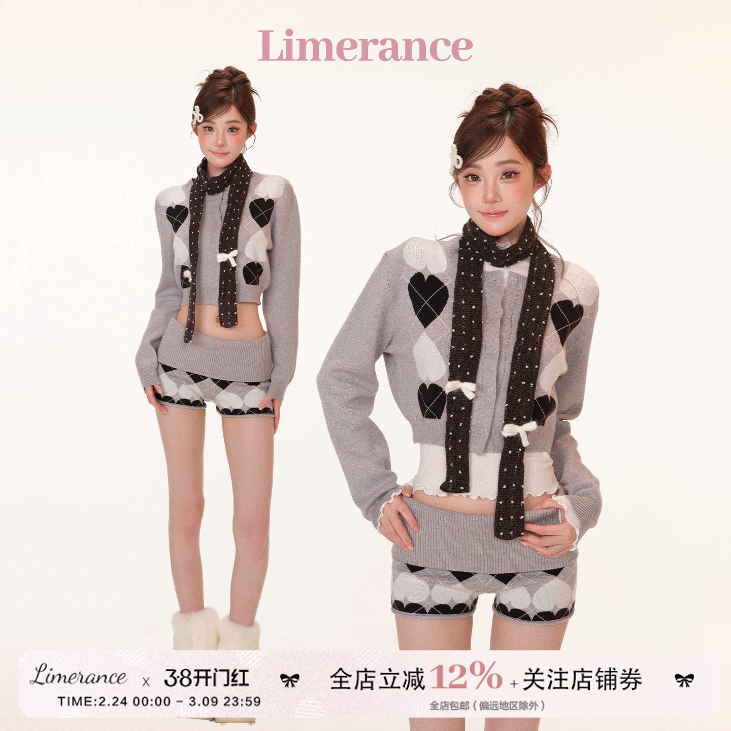甜梨呆呆 桃乐丝梦境 春季爱心格毛衫短裤套装+绣花打底衫两件套