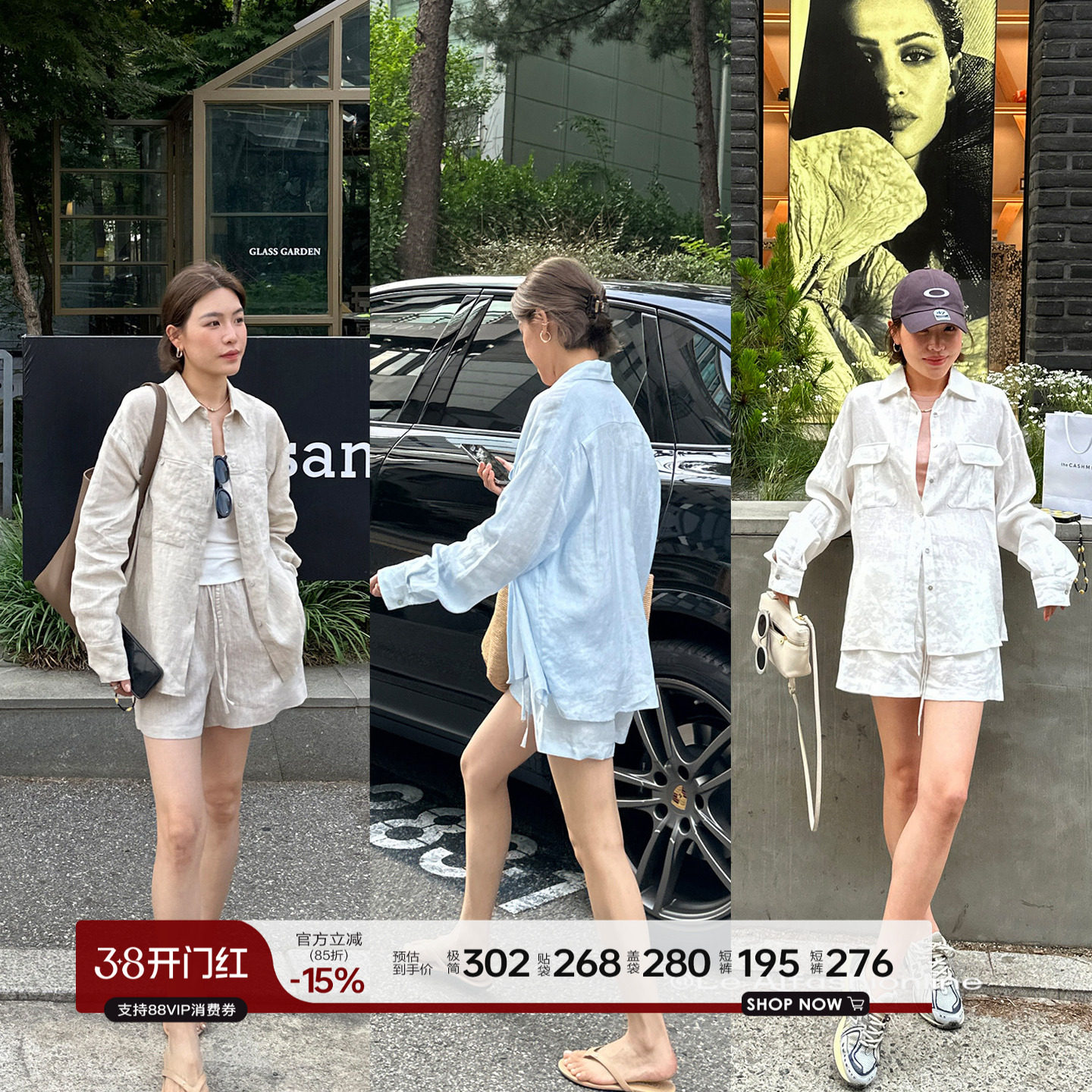 NEVA HU 苎麻衬衫三件套装女慵懒松弛感宽松长袖衬衣阔腿短裤长裤