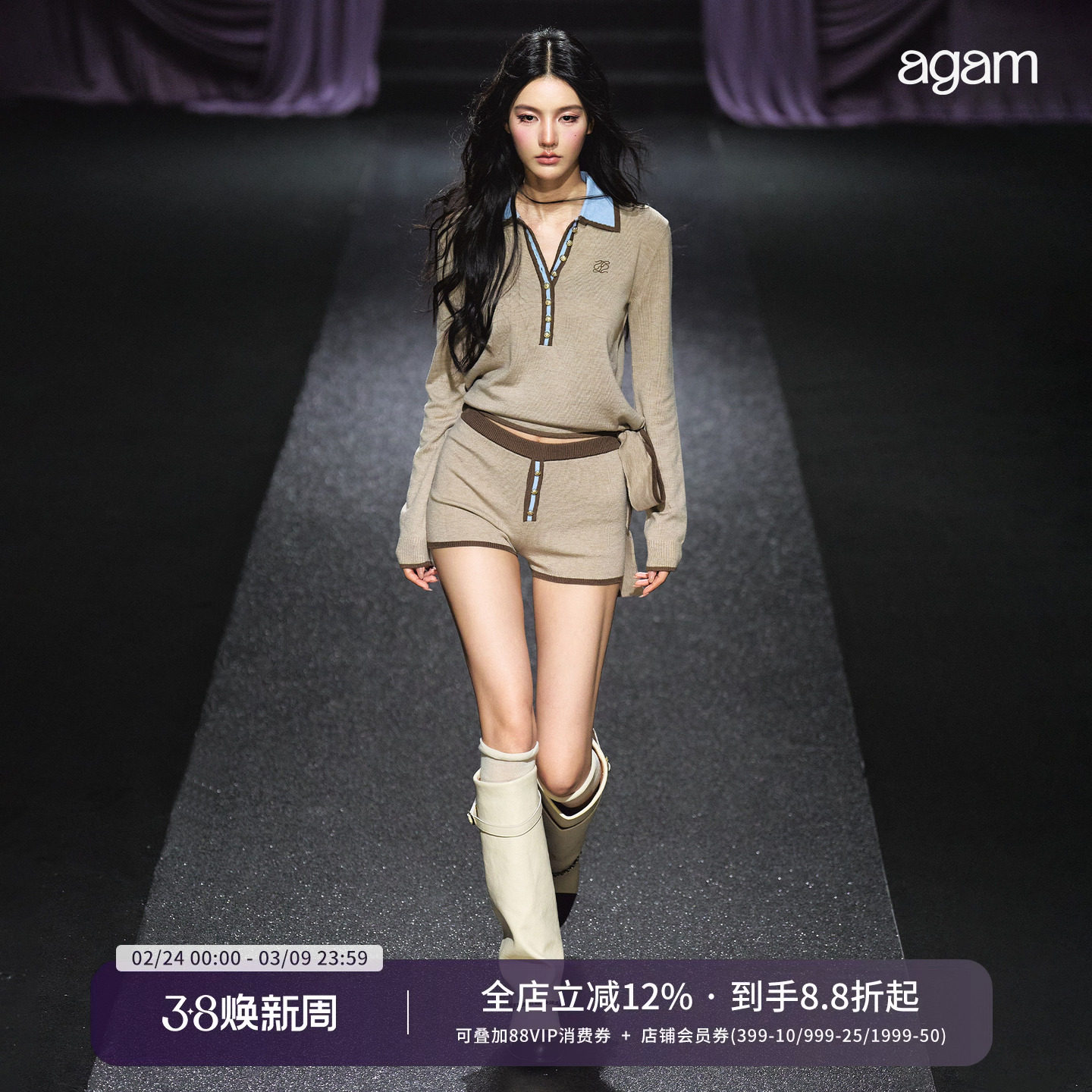 AGAM 流沙粉金立领麂皮绒夹克收腰外套/小香风短裤套装两件套女