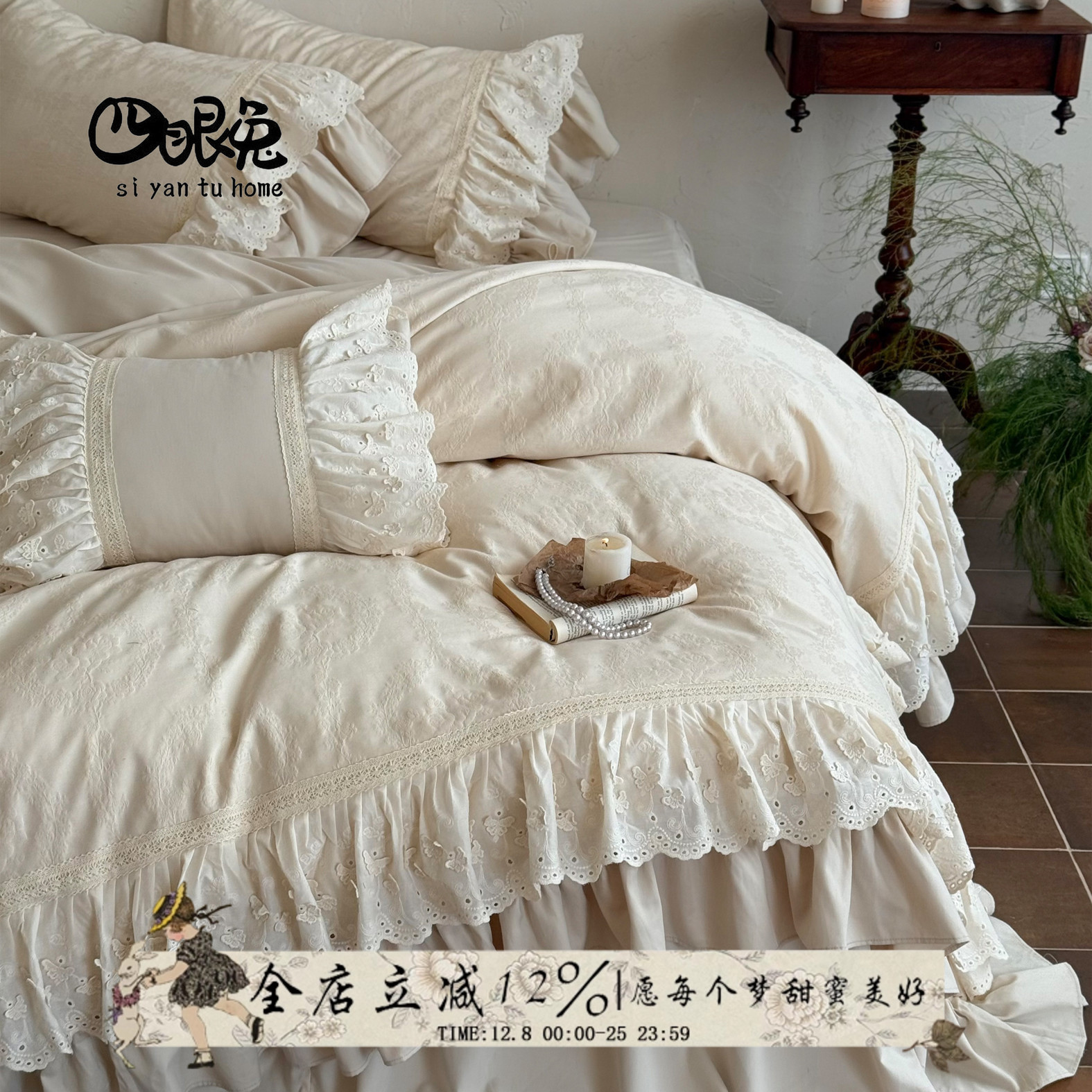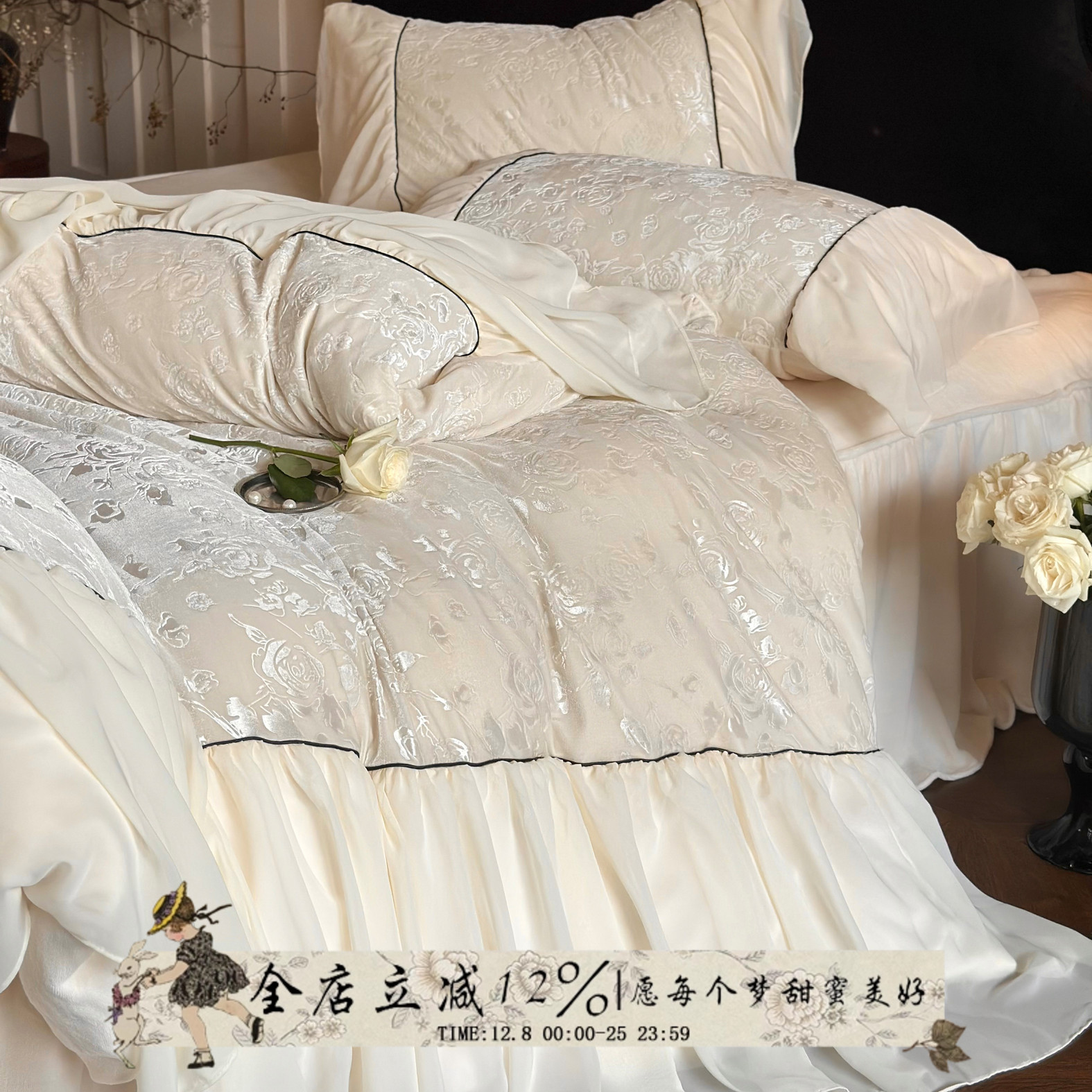 奶芙绮梦︱法式优雅提花全棉磨毛床裙四件套纯棉蕾丝花边被套床品