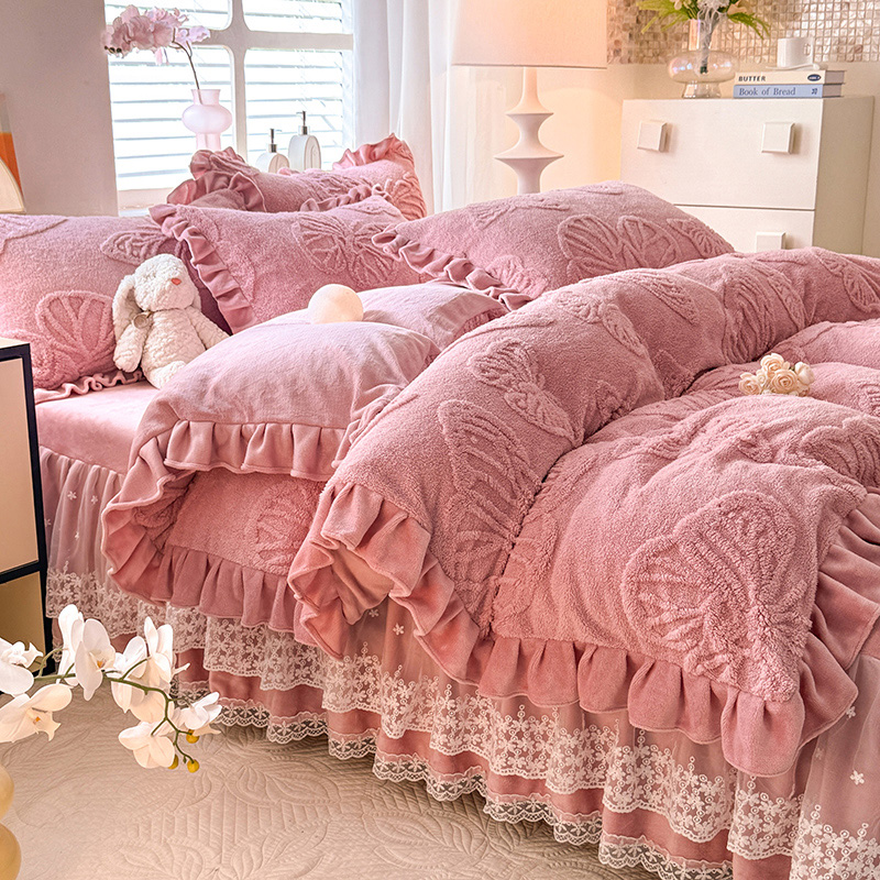 冬季浪漫法式花边牛奶绒床裙四件套公主风珊瑚绒加绒被套床单床笠
