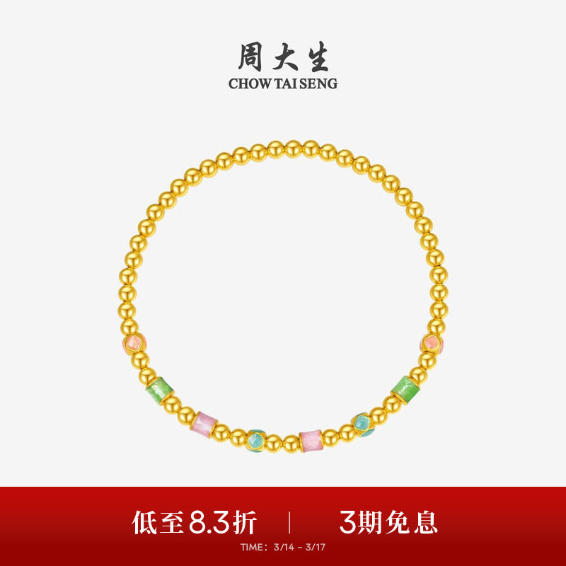 周大生黄金手串女款足金硬金珐琅缤纷四季金珠桃花手链送女友礼物