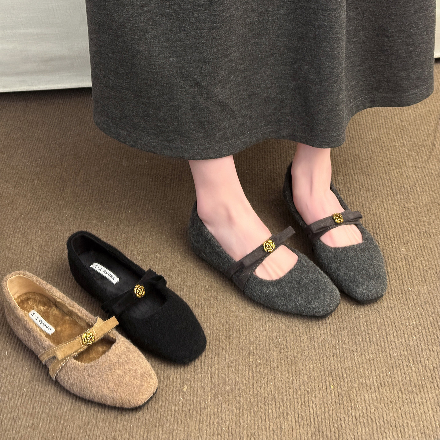 羊皮版复古玛丽珍鞋女方头秋冬季加绒保暖毛毛棉鞋平底晚晚单鞋女