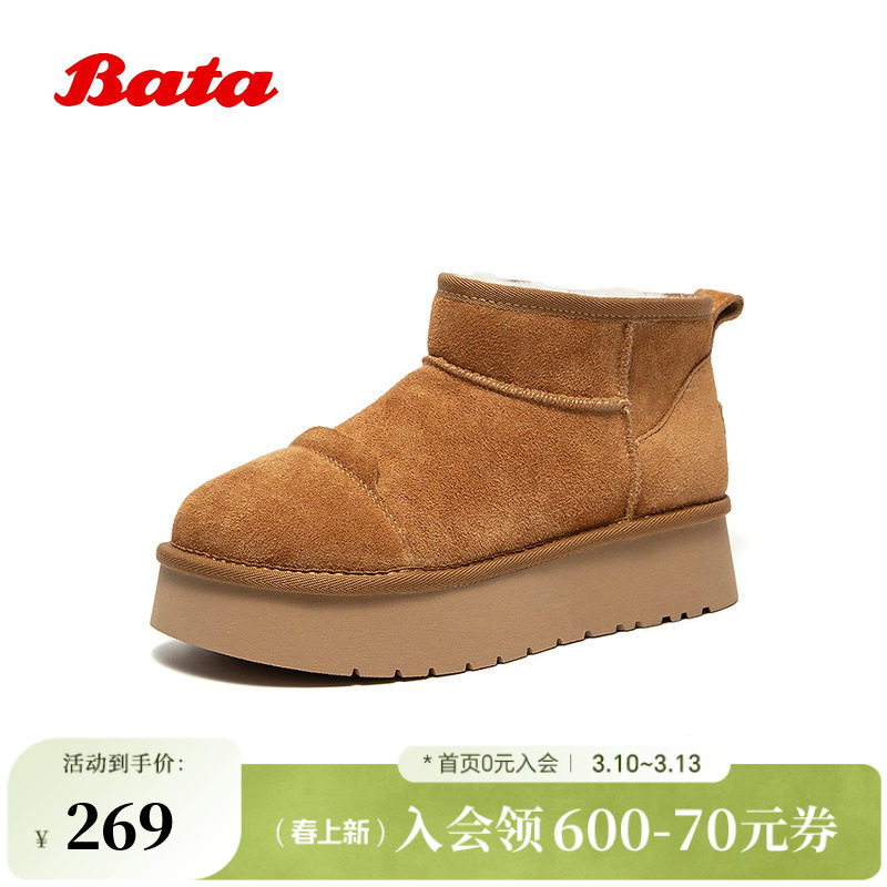 Bata毛毛鞋女冬季新款舒适保暖牛剖皮厚底加绒单鞋58532DM5