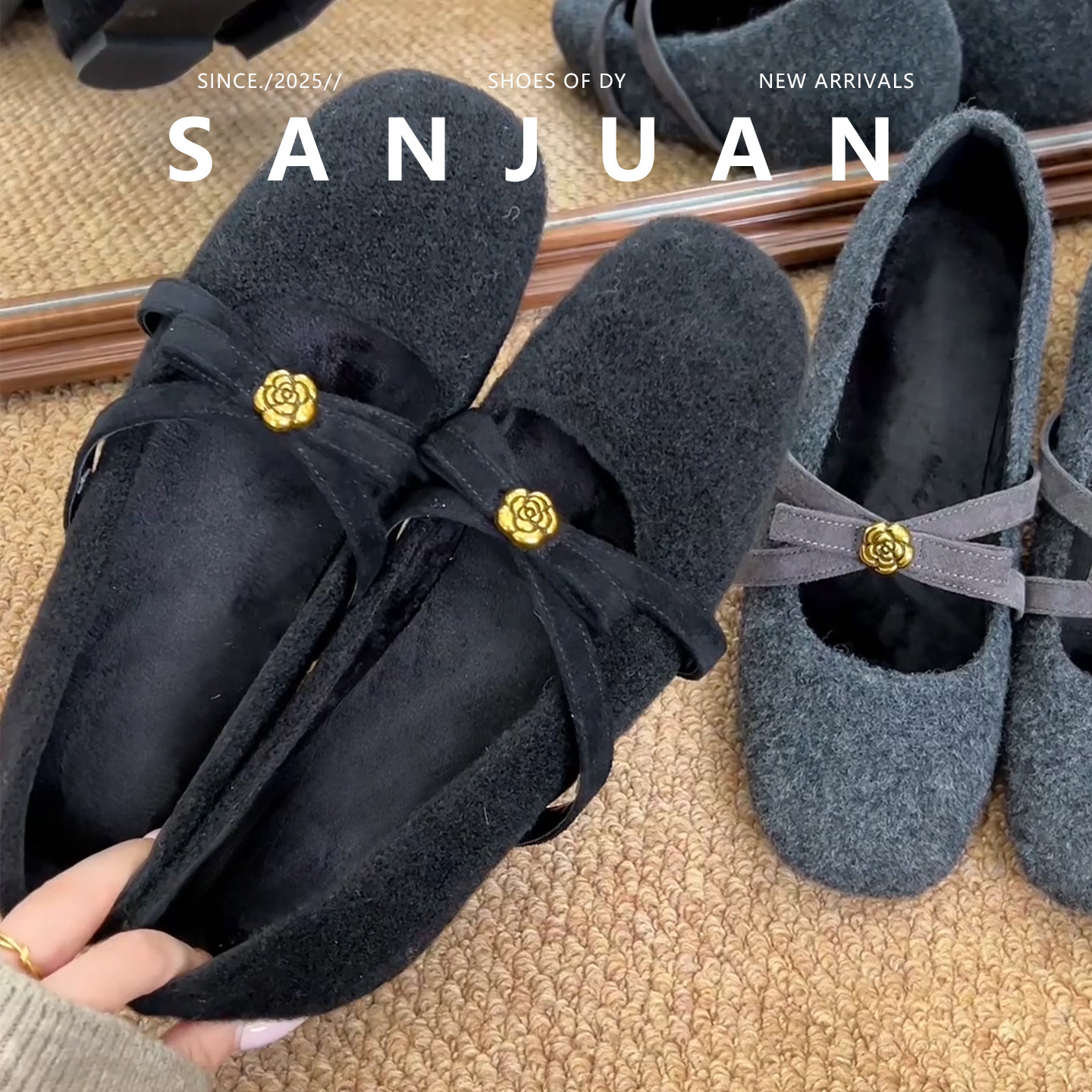 羊皮版sanjuan三卷方头山茶花玛丽珍鞋加绒单鞋一脚蹬毛毛鞋外穿