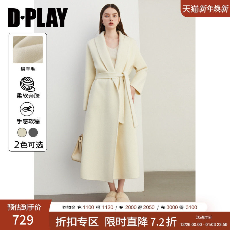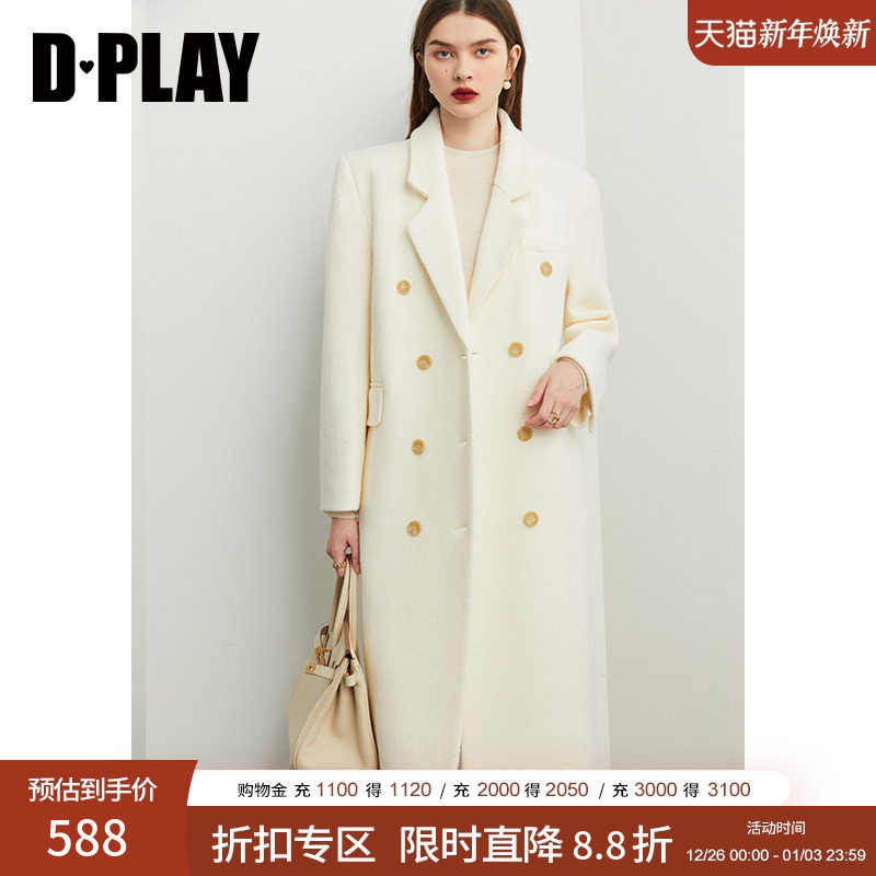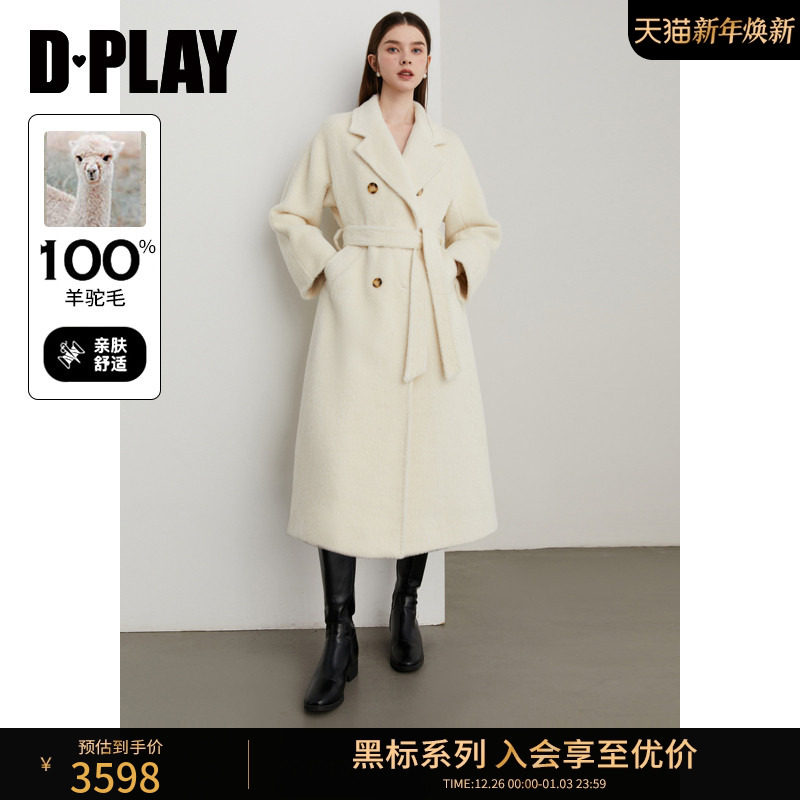 DPLAY【黑标】2025年春季新款白色大衣女苏力100羊驼毛毛呢外套
