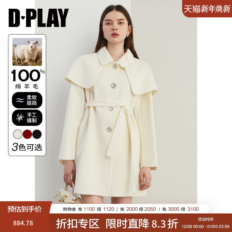 DPLAY2025冬季新款白色大衣100羊毛好看短款双面呢子毛呢外套女