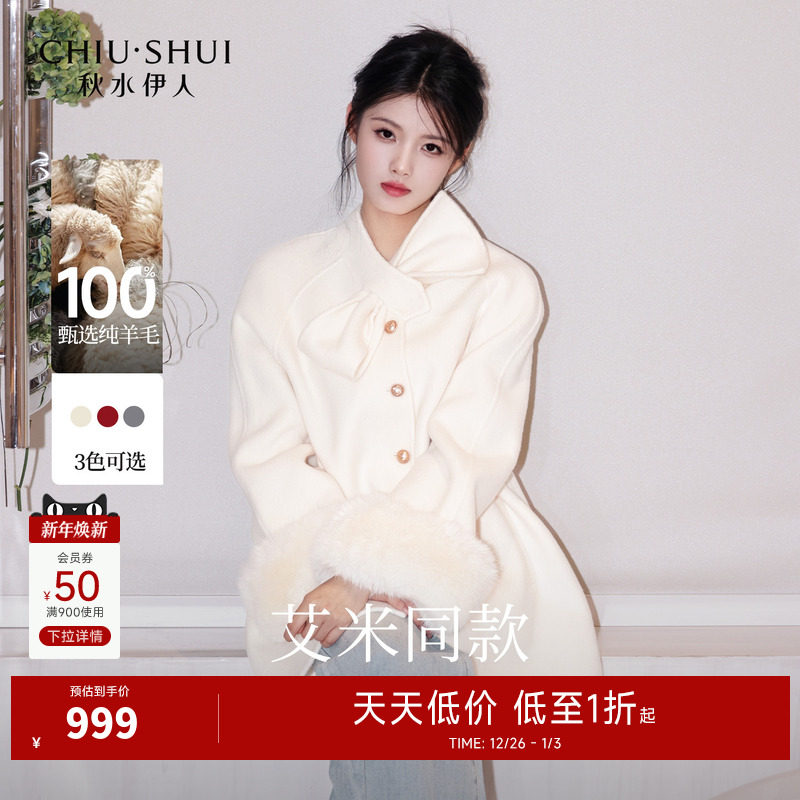 【100%绵羊毛】秋水伊人蝴蝶结领白色大衣女2025冬季新款毛呢外套