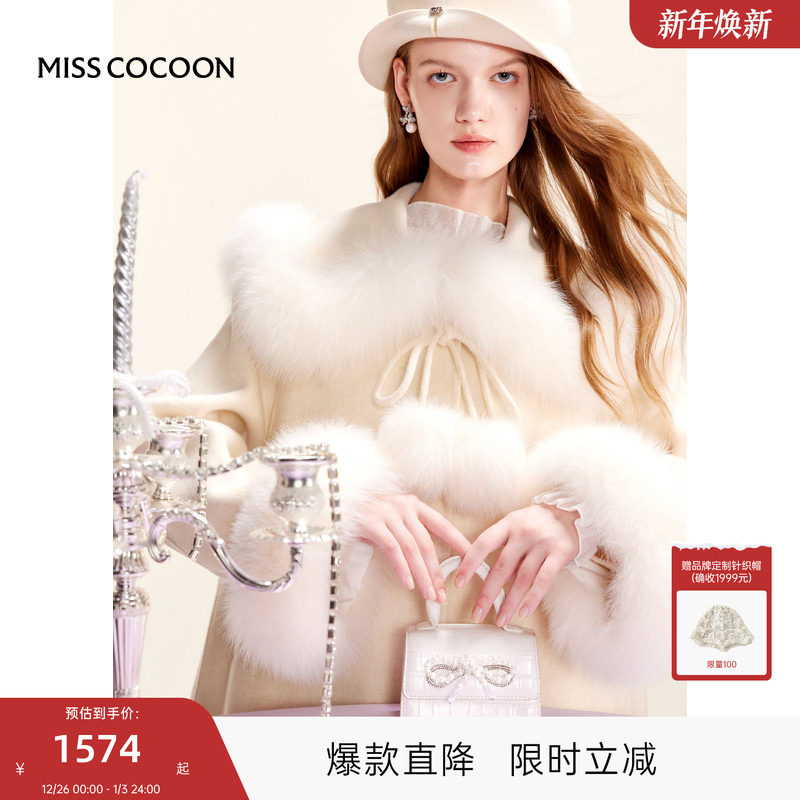 MISSCOCOON可可尼翻领白色大衣女2025冬季新款千金风毛球双面呢