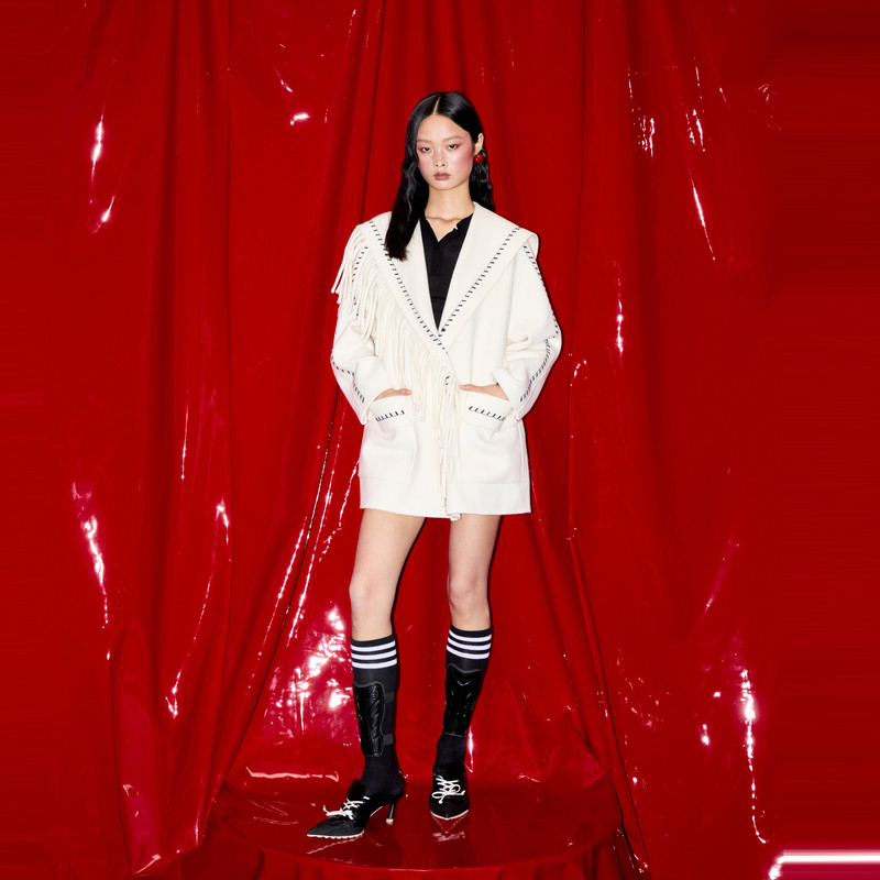 REVAN芮范樱桃系列质感斜肩流苏白色大衣RM90302330