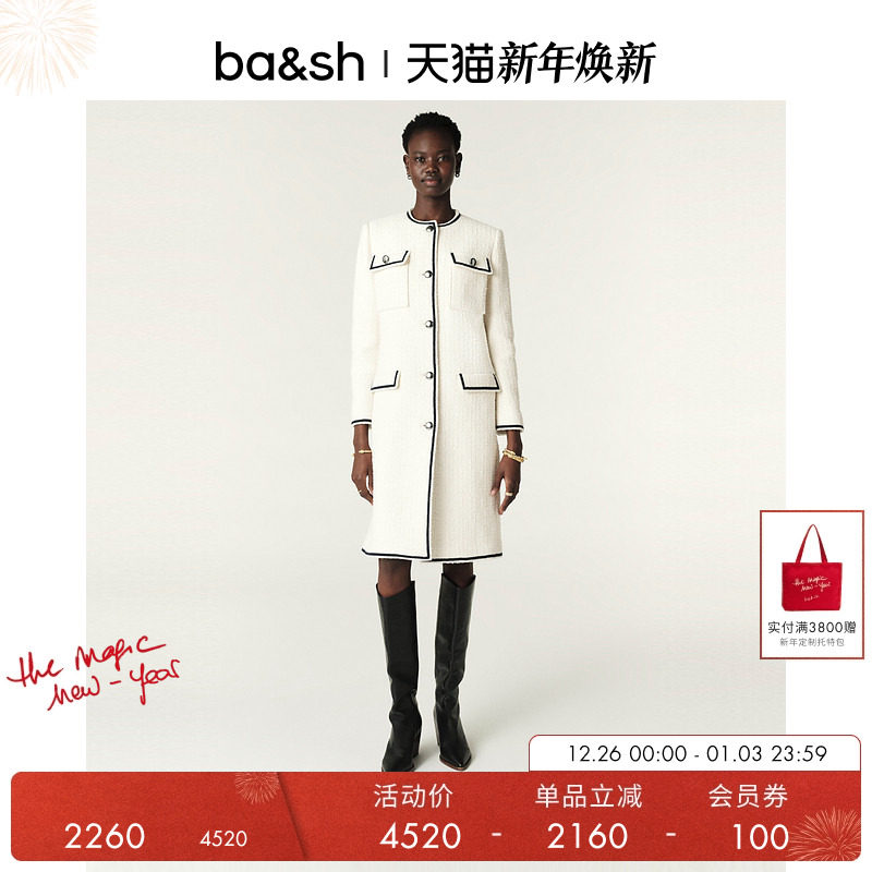 bash冬季法式优雅气质小香风粗花呢中长款白色大衣外套1E24ROME