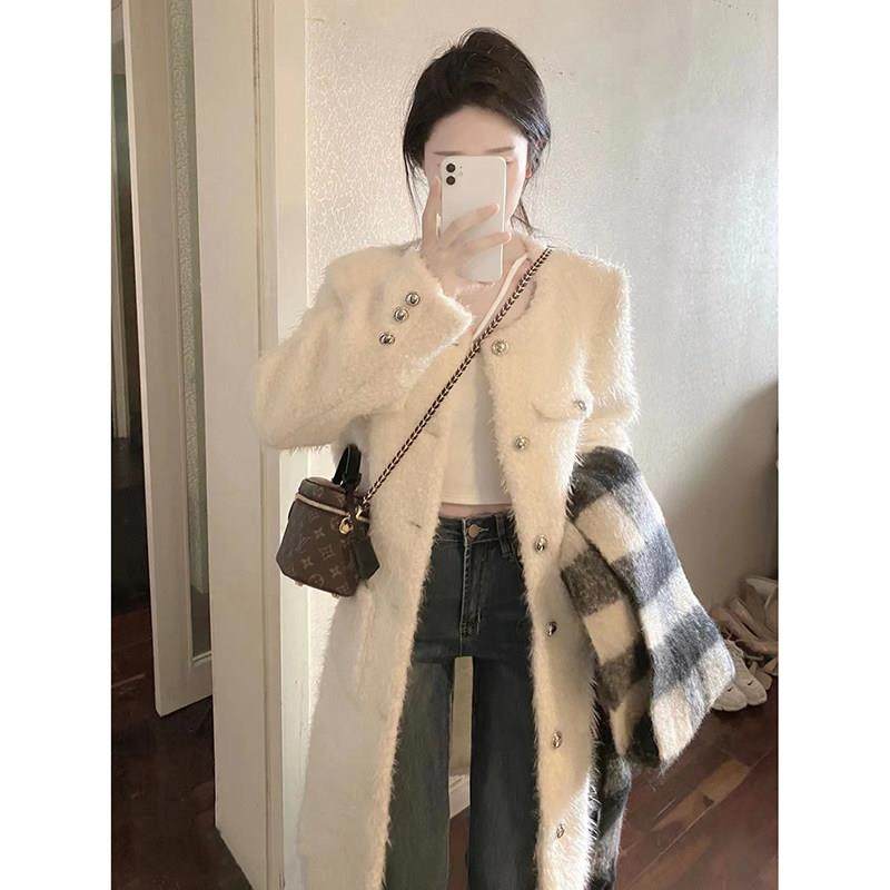 韩国2025冬新款仿羊羔毛小香风白色大衣毛毛皮草中长款西装外套女