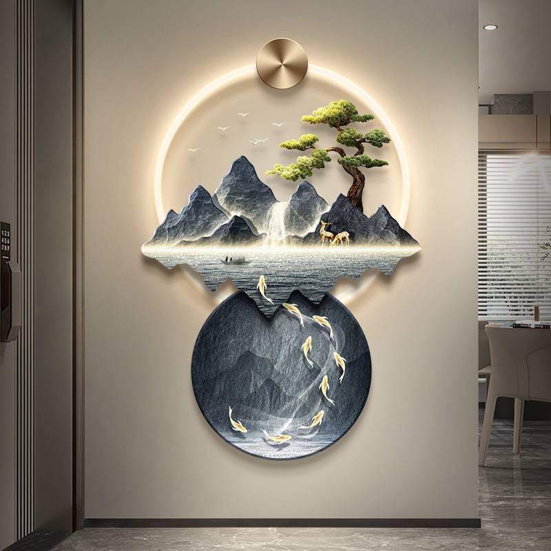 轻奢入户玄关装饰画新中式流水生财山水灯画高档走廊过道立体壁饰