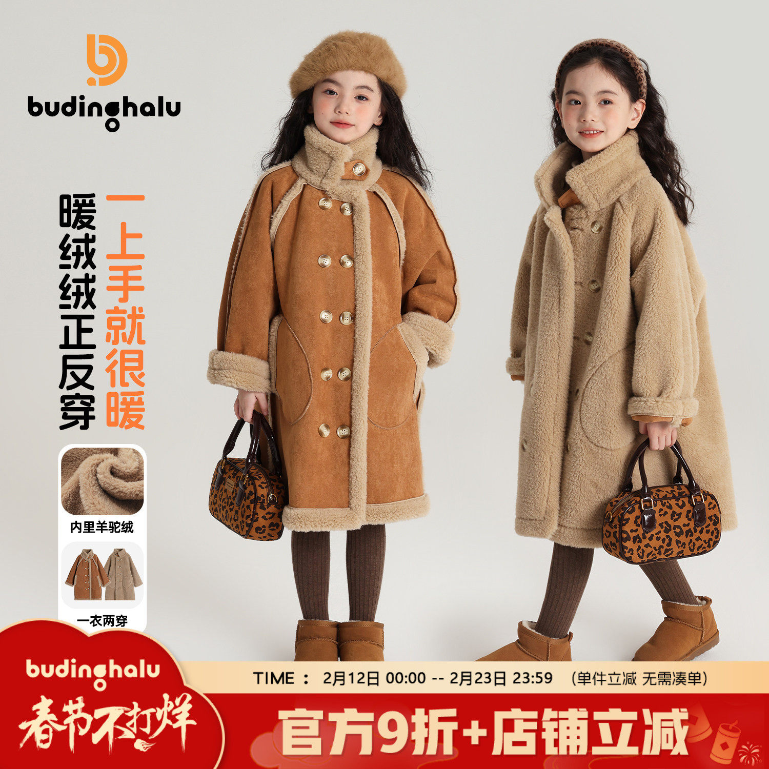 布丁哈鲁冬装童装女童2026秋冬儿童麂皮绒双面穿加绒外套加厚保暖
