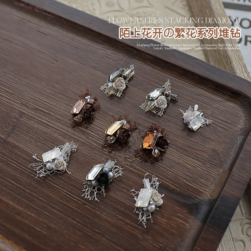 繁花高定轻奢水晶锆石美甲成品堆钻陌上花开冰糖山茶花指甲钻饰品
