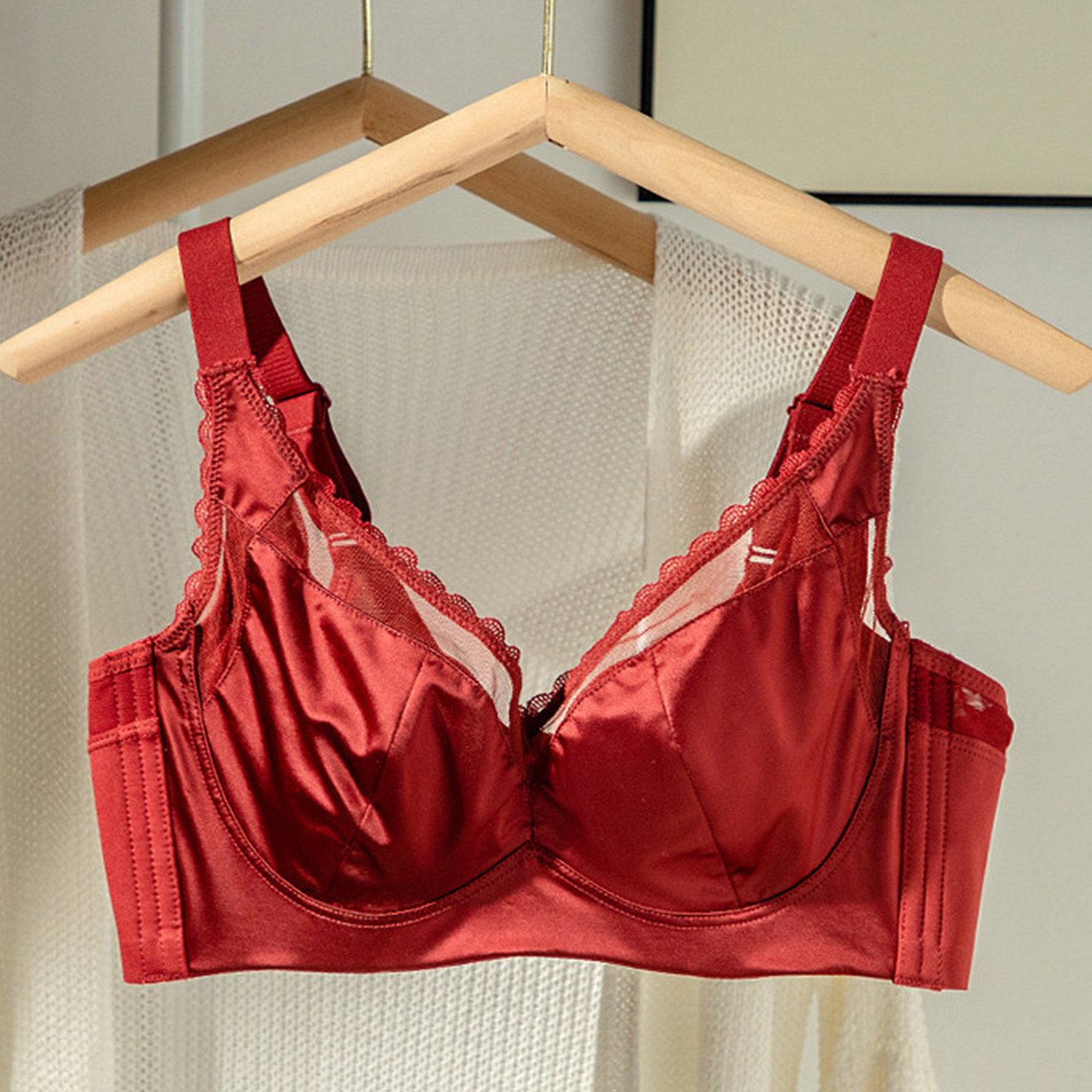 本命年红色结婚内衣女大胸显小调整型薄款收副乳防下垂大码文胸罩