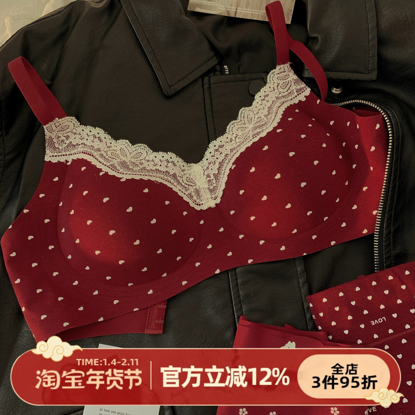 JoyceBra甜美波点红色内衣套装女薄款小胸透气结婚新娘本命年文胸