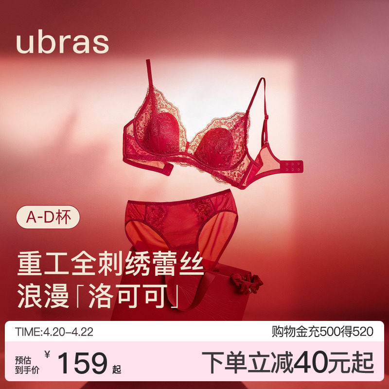 ubras蕾丝红色内衣女性感小胸聚拢礼袋新娘结婚送礼本命年文胸罩