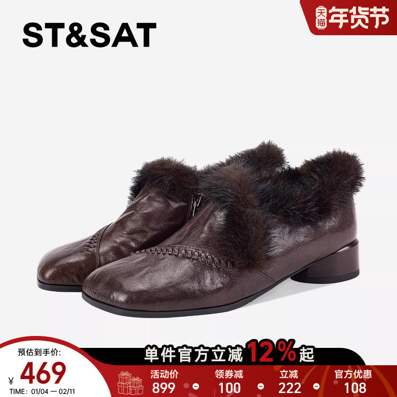 星期六复古冬季加绒单鞋女2025新款方头粗跟时尚保暖小皮鞋毛毛鞋