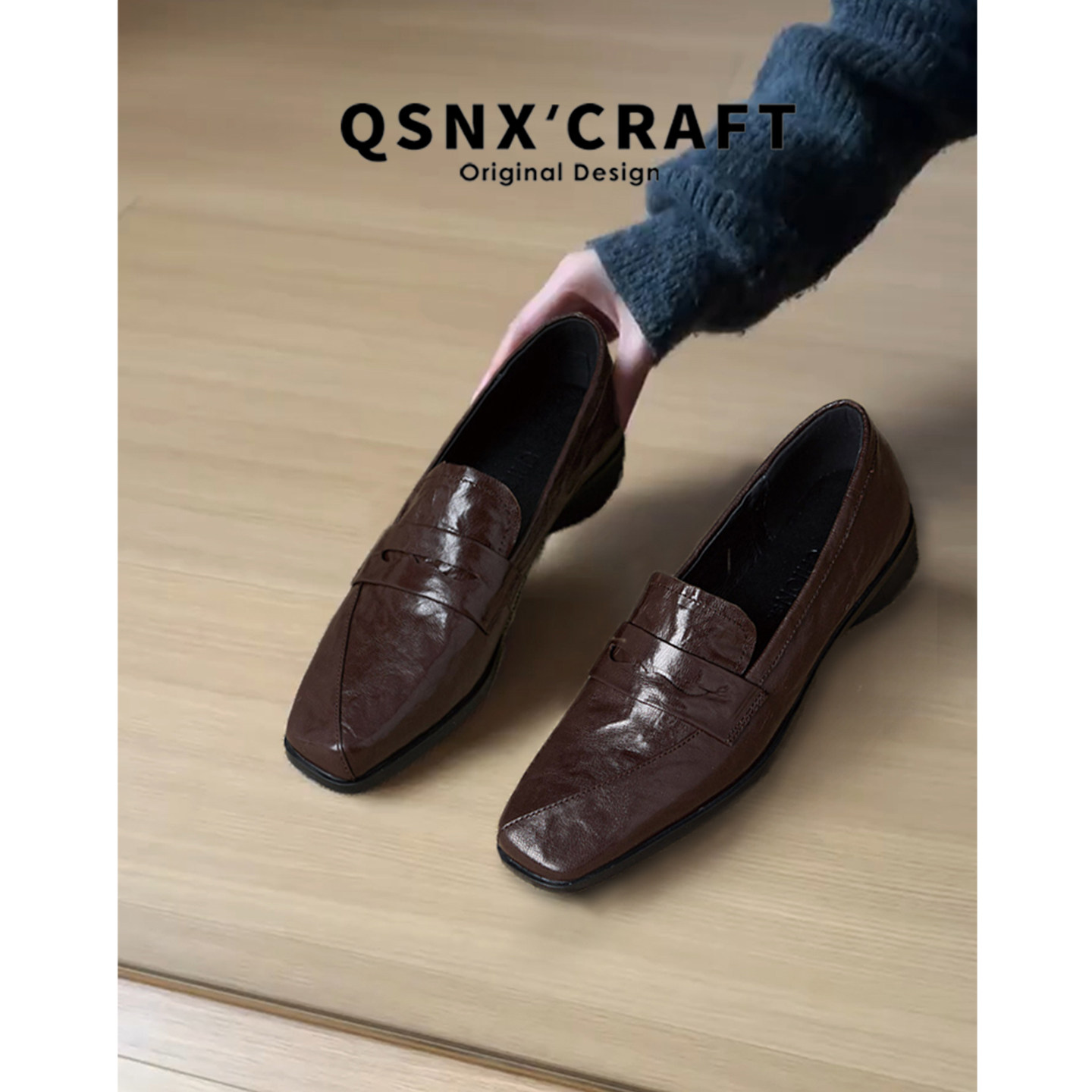 羊皮~方头乐福鞋女2025新款一脚蹬通勤单鞋棕色粗跟英伦风小皮鞋