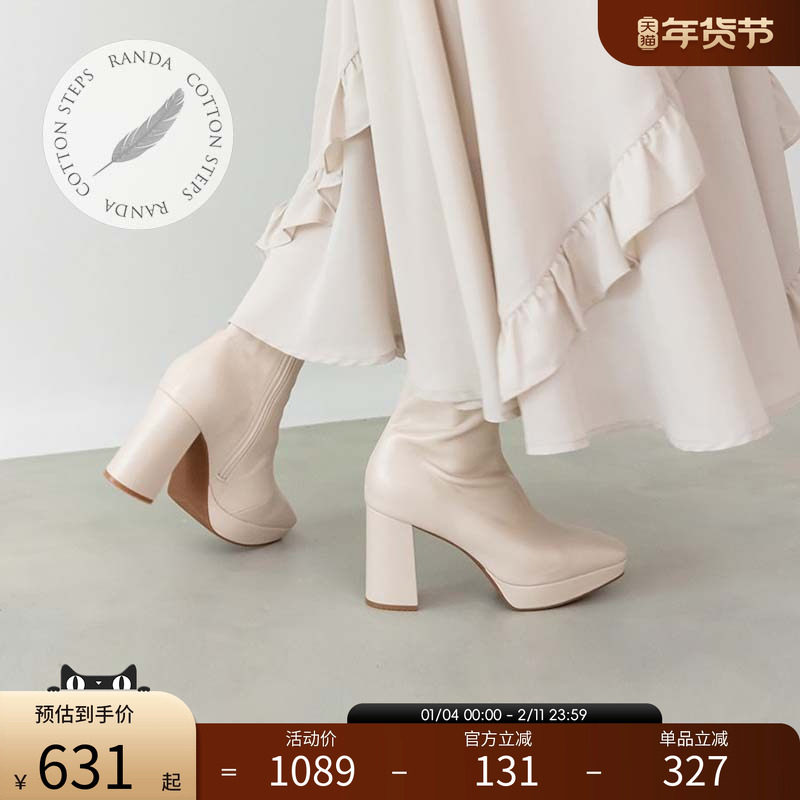 RANDA 25秋季新款COTTON系列方头粗跟拉链防水台女短靴 KC11542