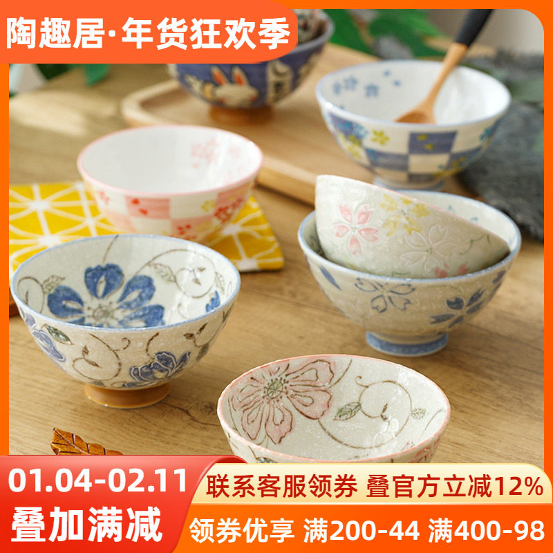 日式情侣饭碗樱花兔子小碗日本进口家用餐具汤碗卡通陶瓷碗釉下彩