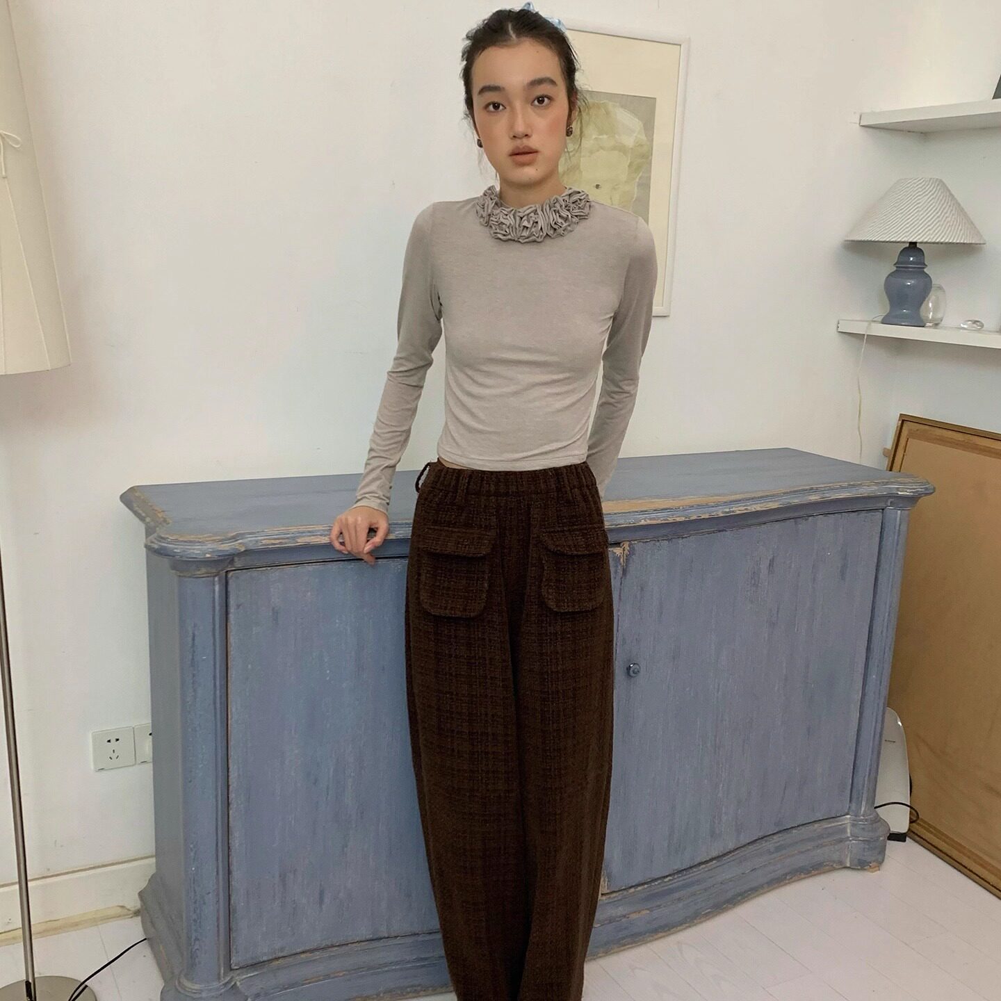 Spoii 灰咖色立体花朵针织修身打底衫/棕色编织中腰灯芯绒萝卜裤