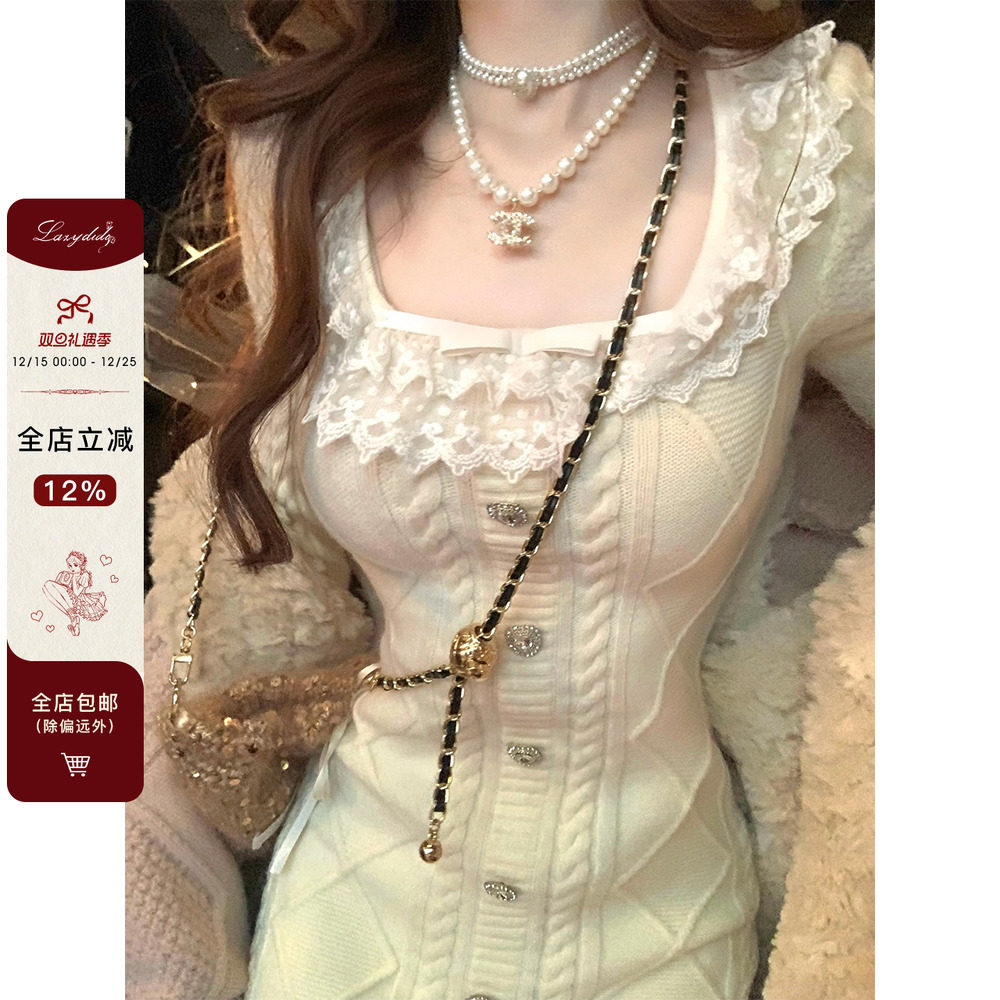 Lazy Didi杏仁烤奶 蕾丝花边领厚实重工纯欲针织修身打底毛衣裙