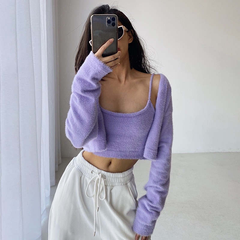 春秋冬马海毛衣女针织修身打底吊带背心开衫上衣毛绒外套两件套装