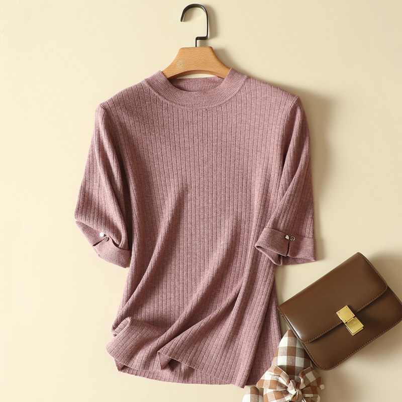 安迪绒半高领中袖T恤女春装2024年新款五分袖针织修身打底衫毛衣
