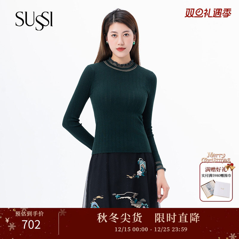 SUSSI/古色26春商场同款墨绿色圆领毛针织修身打底衫上衣女