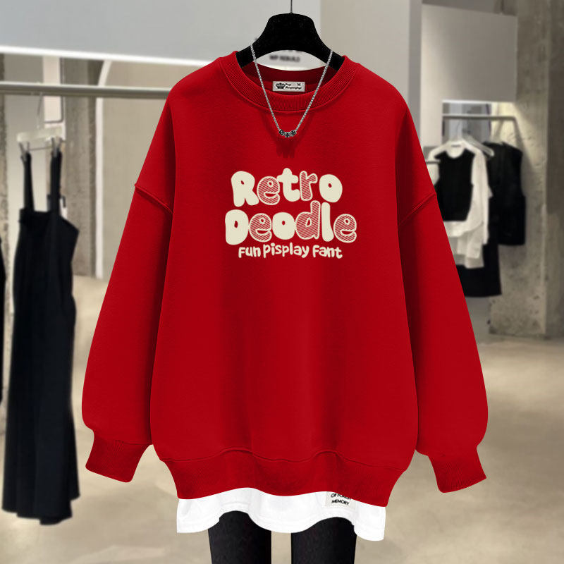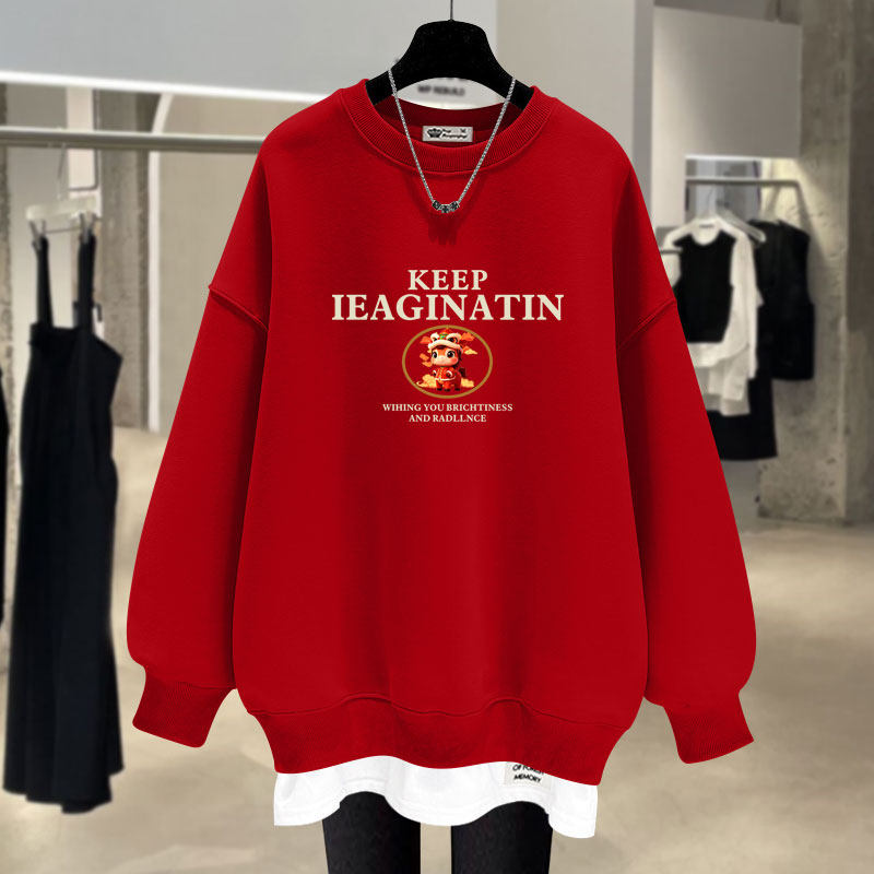 红色假两件卫衣女加绒2025新款春秋冬薄款字母卡通宽松圆领中长款