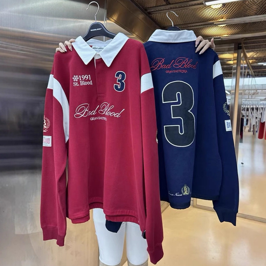 韩国badblood bcac系列美式复古长袖宽松卫衣女球衣红色小众上衣