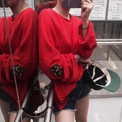 现货韩国东大门女装2024秋装新款休闲慵懒宽松红色百搭上衣卫衣sm