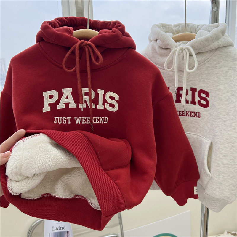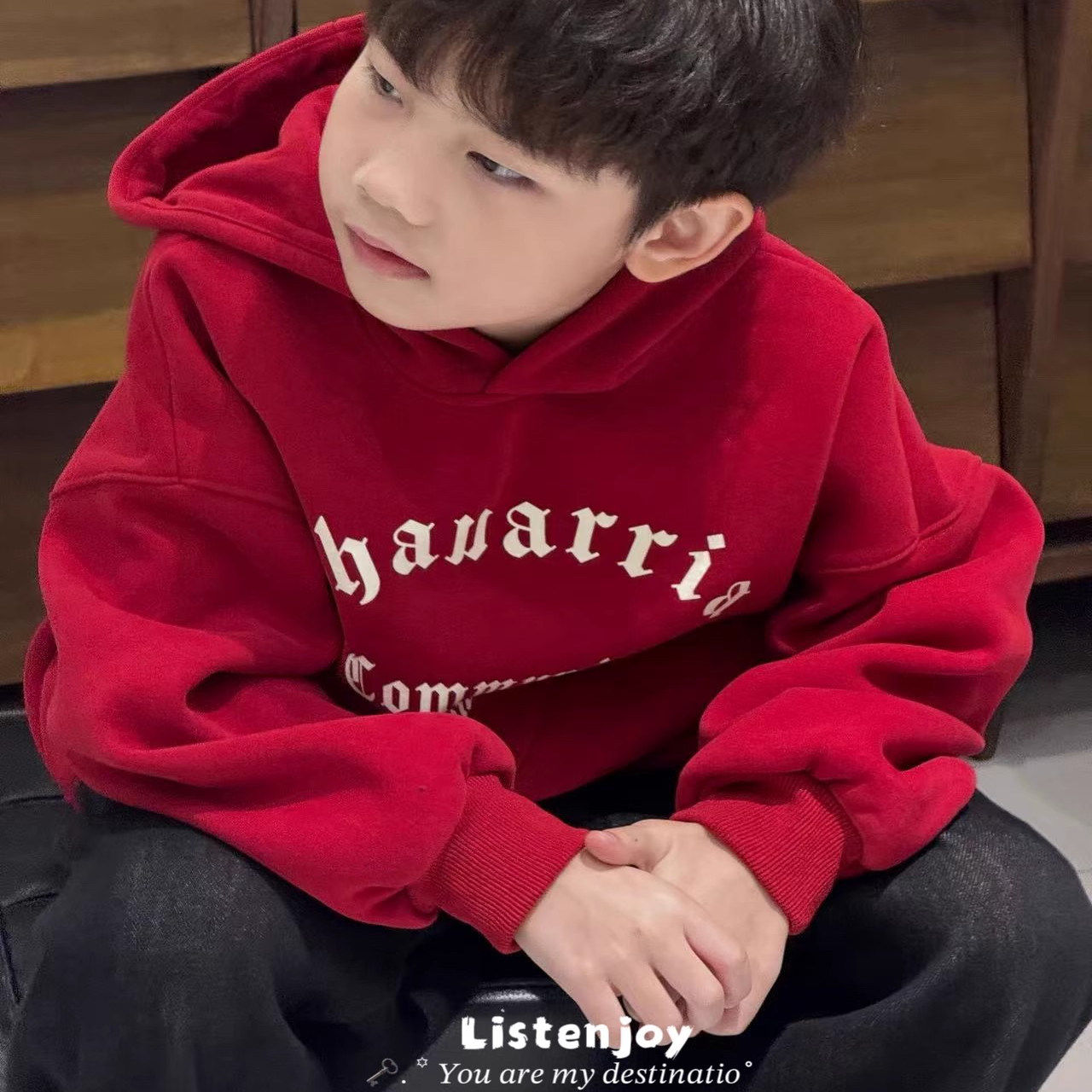 韩式美式儿童加绒休闲风红色连帽卫衣男女童加厚字母印花宽松亲子