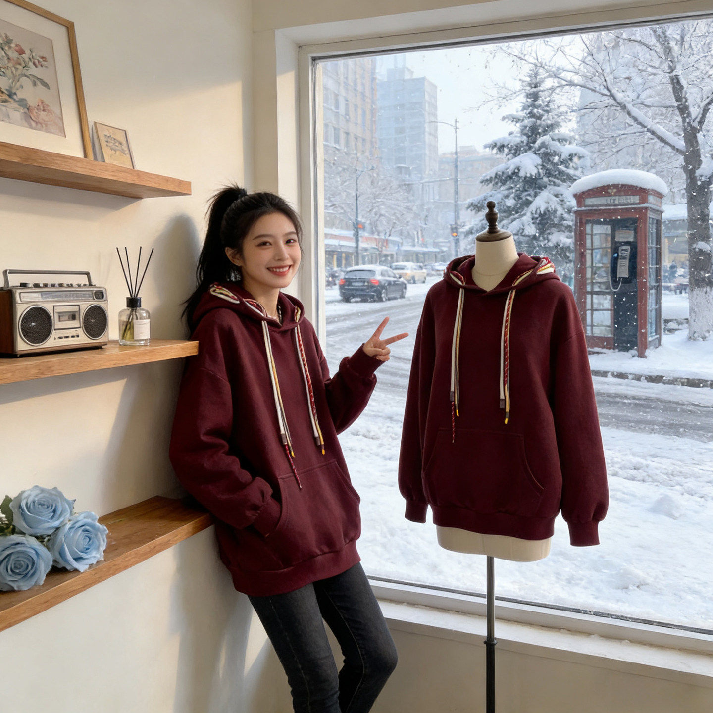 高级加绒连帽卫衣女红色2023新款秋冬宽松长袖上衣休闲慵懒风外套