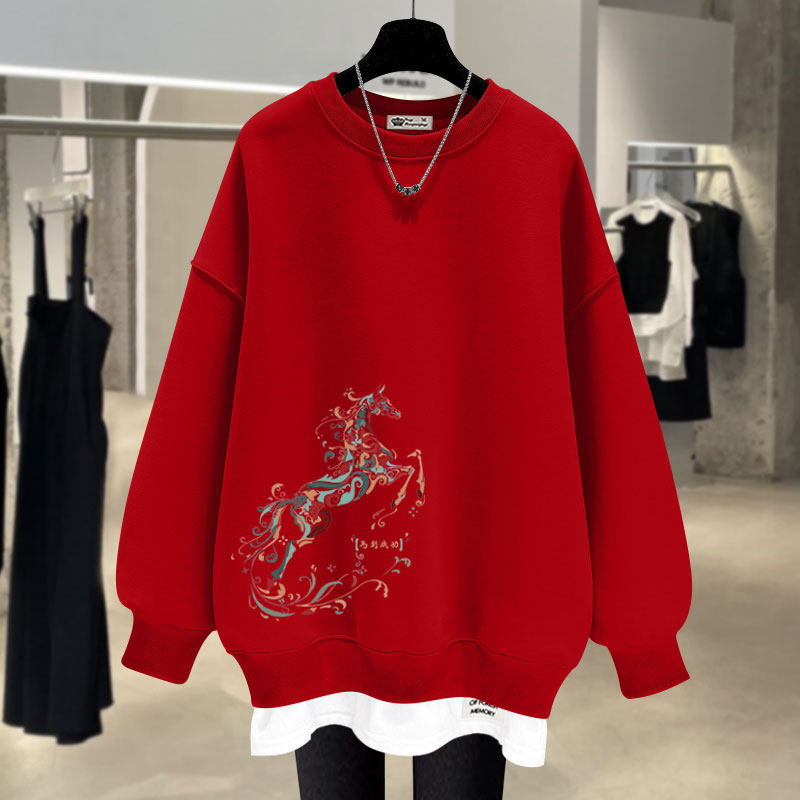 红色假两件卫衣女加绒2025新款春秋冬季薄款彩绘马宽松圆领中长款