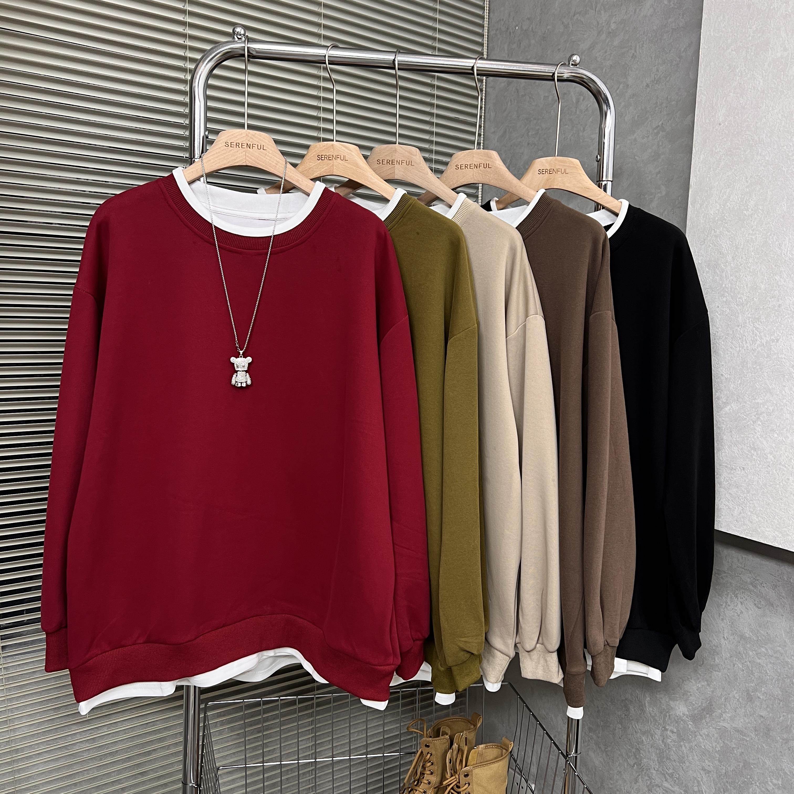 韩国红色假两件设计卫衣女秋冬新款宽松中长款套头上衣男女情侣款