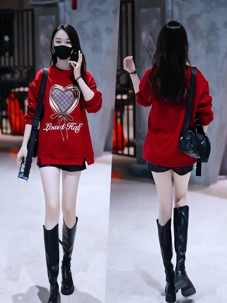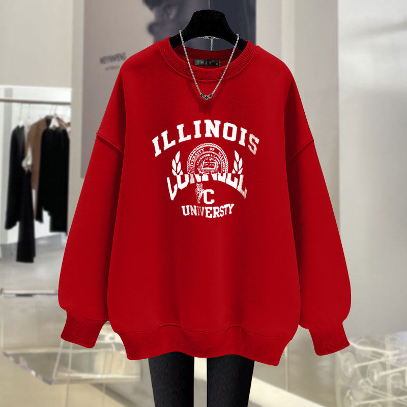 洋气休闲字母圆领卫衣女2025春秋冬宽松加绒加厚红色中长款遮屁股