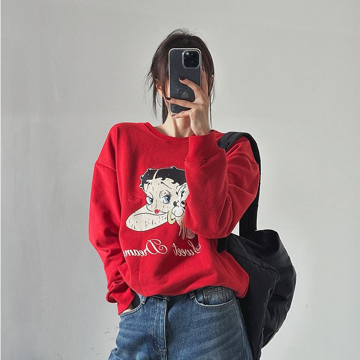 Cmy korea 韩国东大门代购女装 复古红色美女图案宽松卫衣