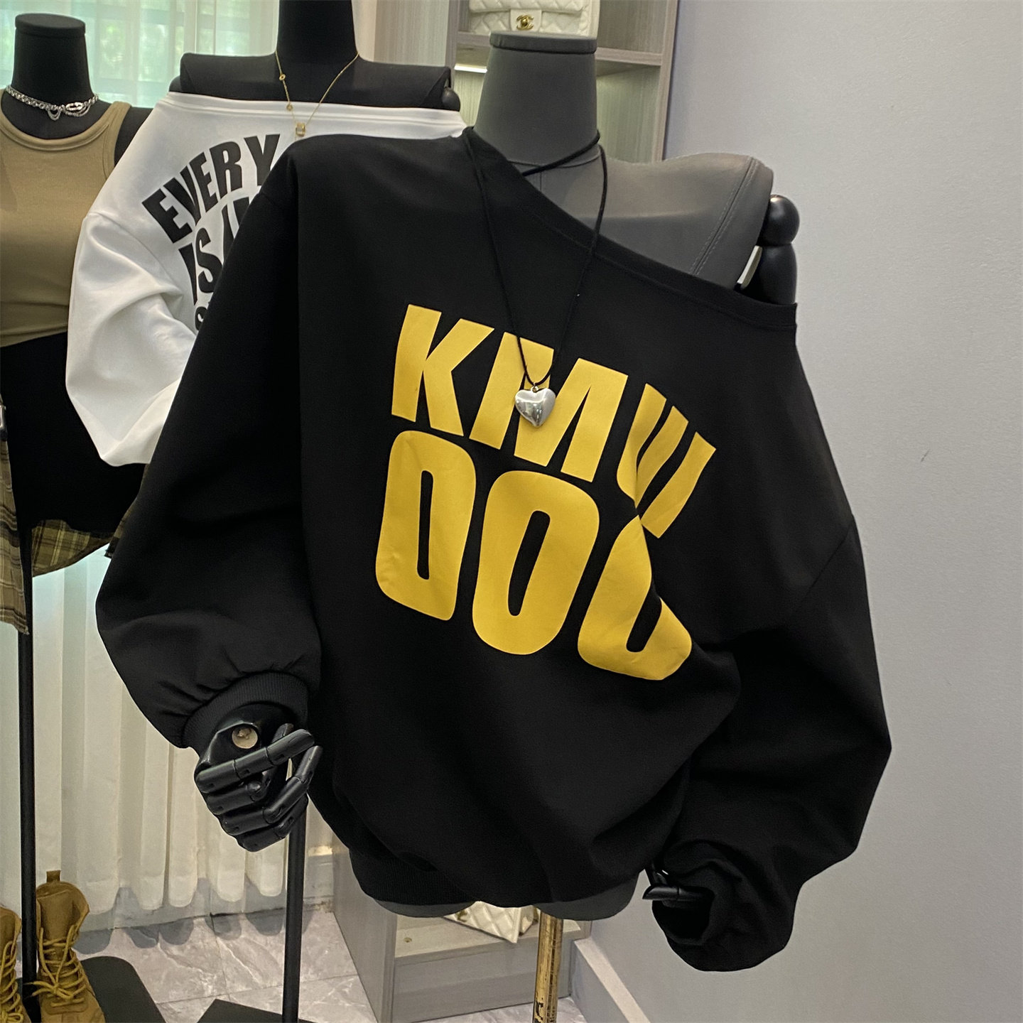 美式辣妹复古字母印花一字领长袖卫衣女休闲宽松显瘦红色露肩上衣