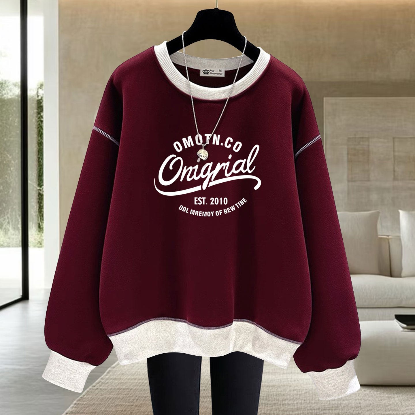 红色卫衣女加绒2025新款春秋冬薄款韩版字母潮流宽松撞色圆领上衣