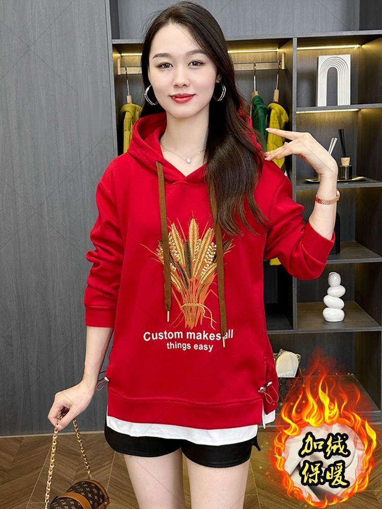 红色假两件卫衣女加绒2025新款春秋冬薄款韩版时尚洋气宽松中长款