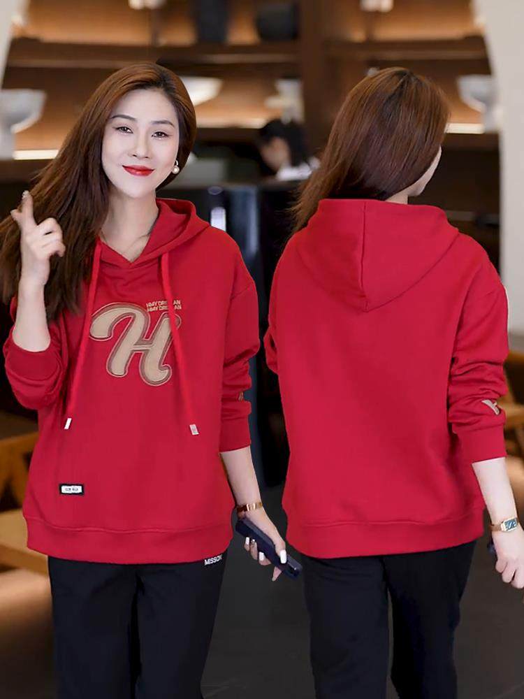 韩国时尚宽松减龄连帽休闲卫衣女秋冬加绒红色绣花中长款大码上衣
