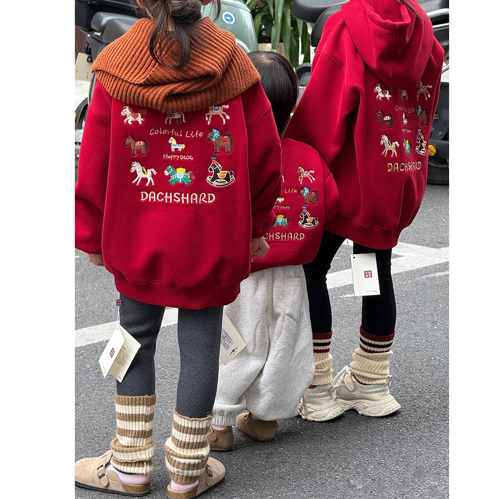 秋冬韩国男女童小马刺绣加绒宽松套头连帽卫衣百搭打底衫红色年服